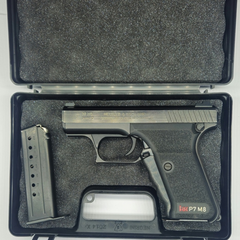 Pistola HK P7 M8 calibre 9mm en buen estado, con dos cargadores.