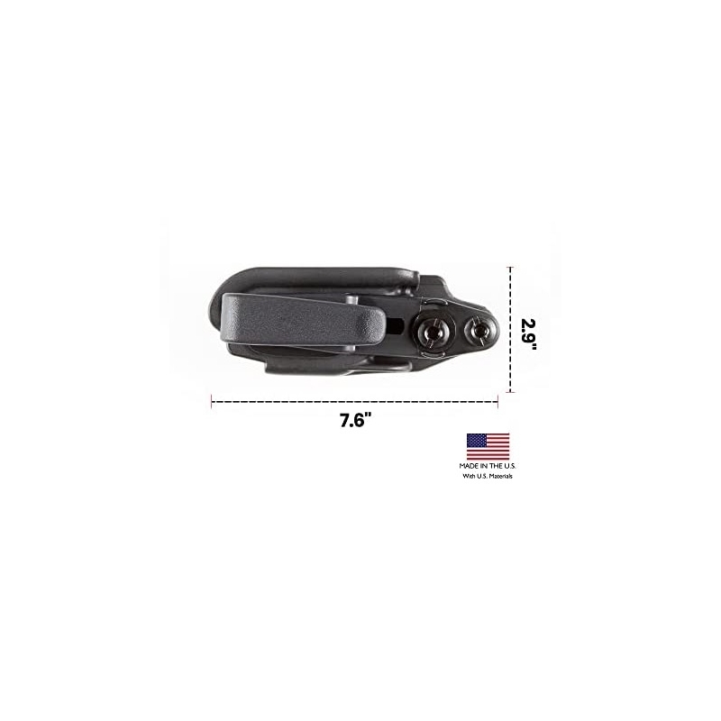 Luego, se puede usar con la correa de línea estática para llevar en el cuerpo (IWB) o fuera del cuerpo (como dentro de una bolsa, bolso, maletín, consola del vehículo, etc.). Esto permite que el arma se transporte de forma segura con un proyectil de recámara sin temor a una descarga negligente, al mismo tiempo que se puede desplegar rápidamente. La funda también se puede quitar agarrando la punta de la funda y sacándola. Esto permite desplegar el arma con una sola mano incluso si la correa o el punto de sujeción no logran quitar la funda.