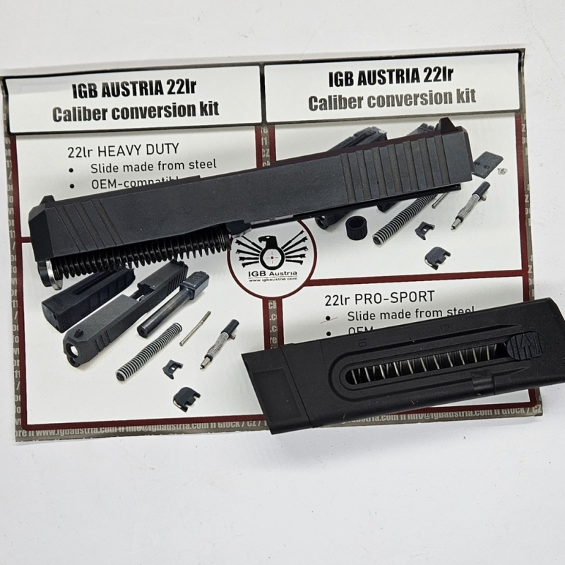 El kit de conversión al calibre 22 lr. para pistolas GLOCK de IGB que incluye corredera mecanizada en aceso y sistema MOS (Sistema Óptico Modular), con tapa de polímero para cubrir el rebaje MOS