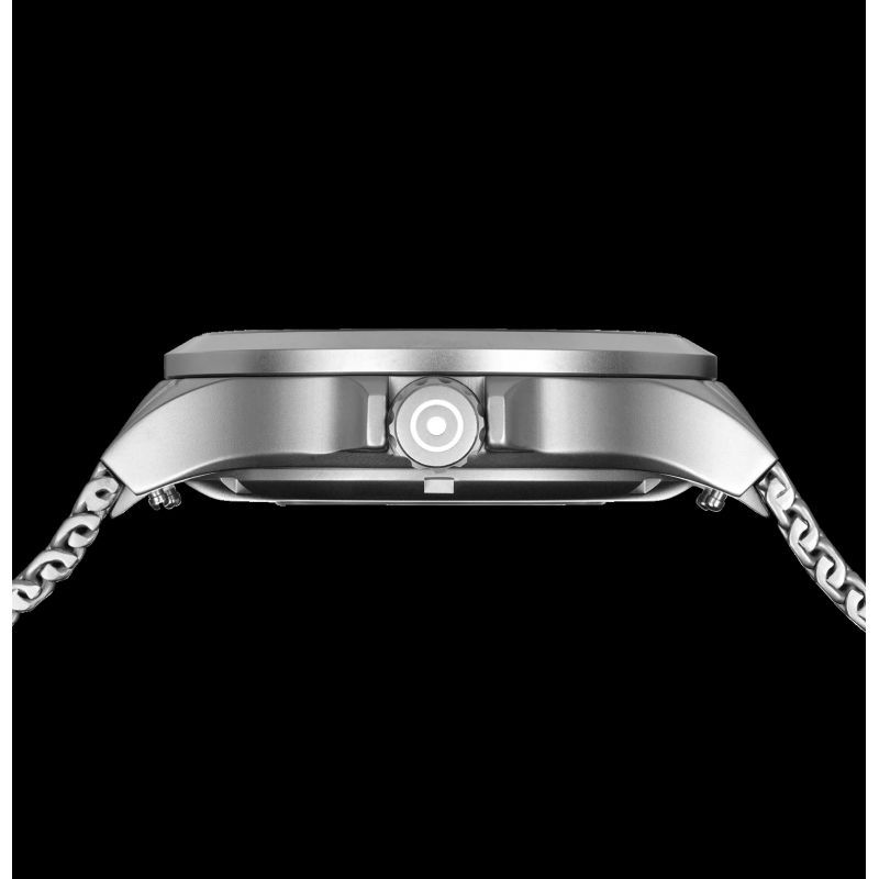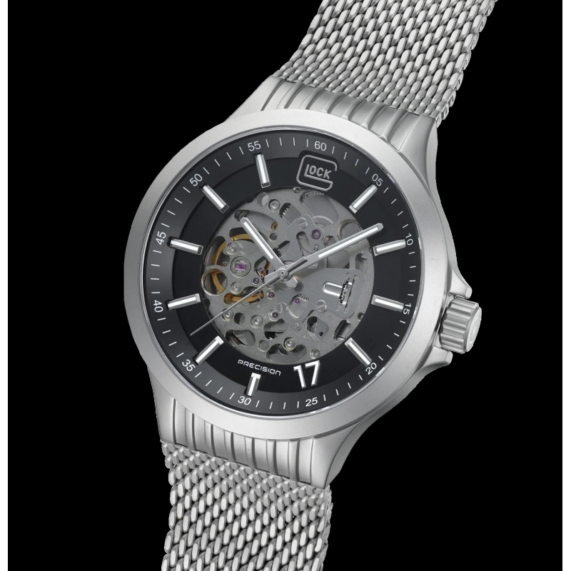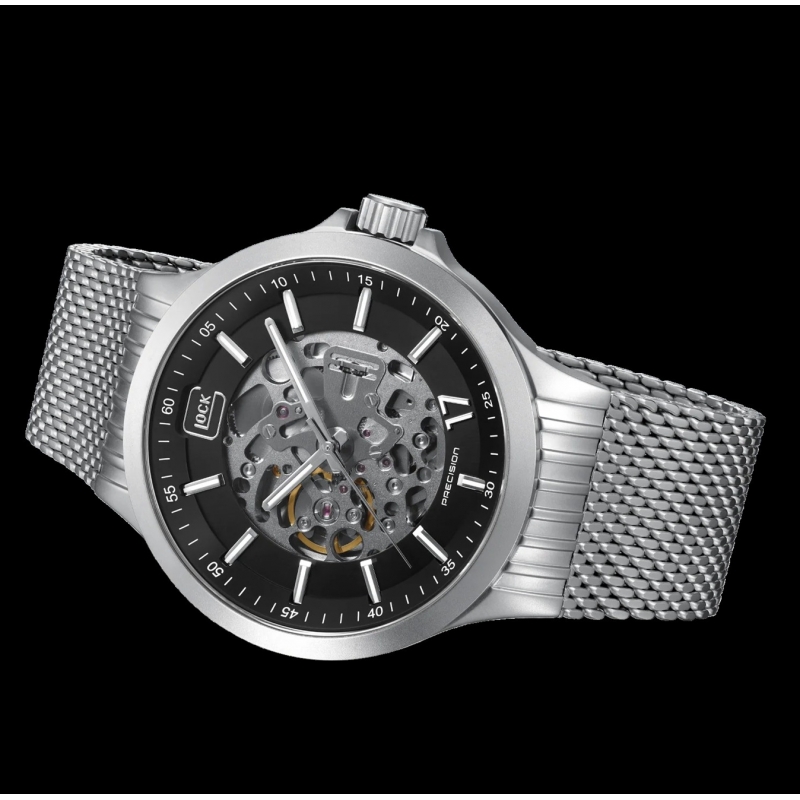 Este reloj luce una caja de acero inoxidable pulido con chorro de arena. Su esfera esqueletizada es el centro de atención, adornada con agujas e índices con Super-LumiNova® suiza. Su atractivo diseño se ve realzado por una elegante correa de malla. Impulsado por un movimiento automático y con una resistencia al agua de 10 ATM, este reloj garantiza una precisión y fiabilidad constantes.
