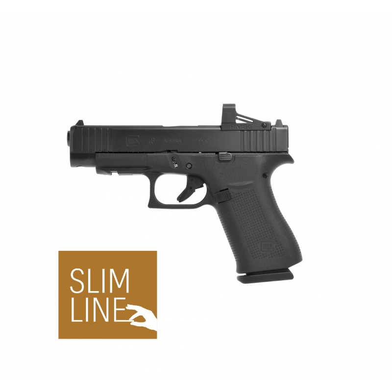 La G48 MOS en calibre 9x19 tiene medidas en altura y largura a una G19 pero con una redución de anchura del arma considerable, lo que optimiza su transporte y el uso de arma con fundas de porte oculto
