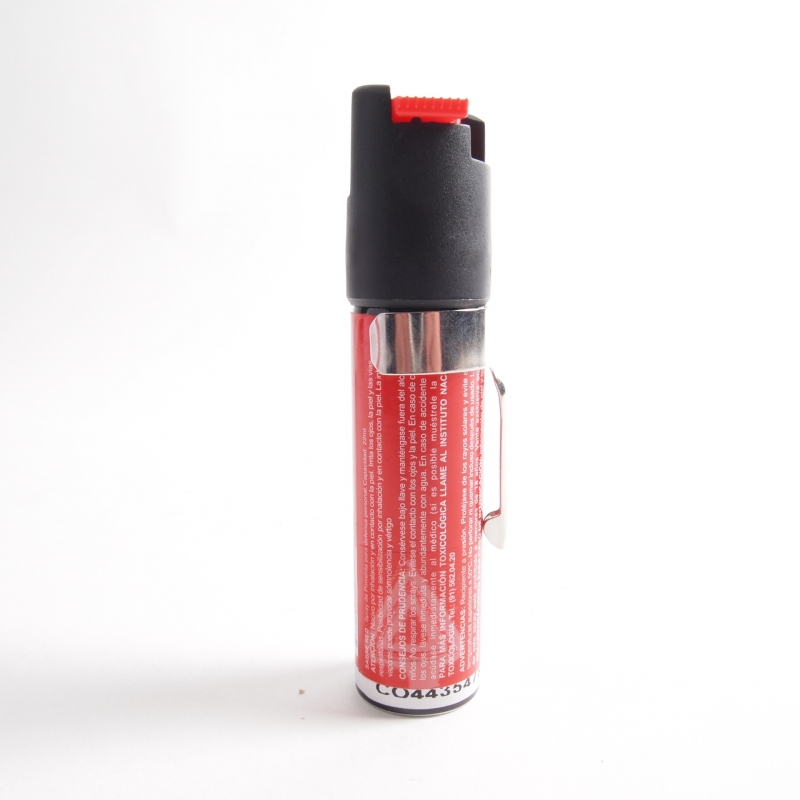 Spray de defensa de pimienta con tamaño de bolsillo y pinza de sujeción. Homologado para uso civil.